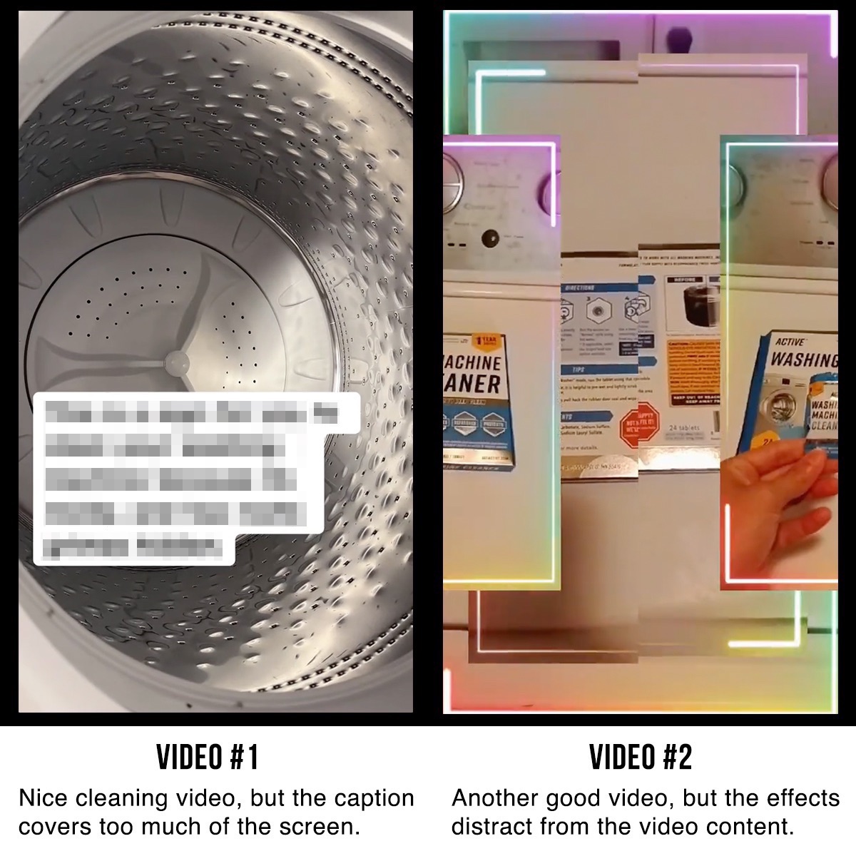 For example, it's difficult to see grime being cleaned if there's a video filter or if there's a large text caption covering too much of the screen.